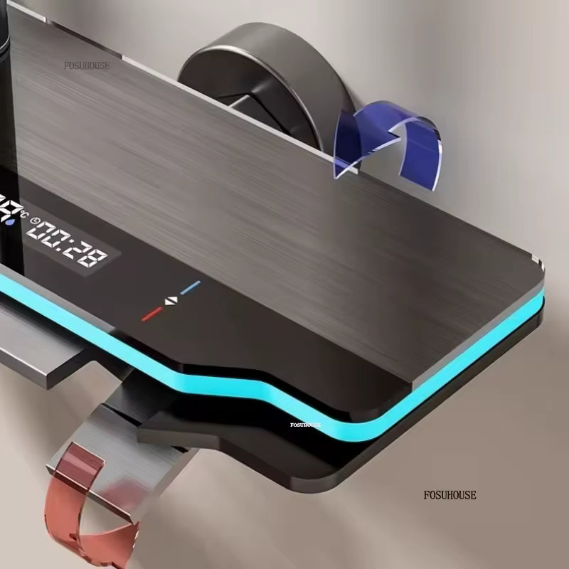 خلاط دش بيانو 2 في 1 مع رف زجاجي – نظام تحكم بأربع وظائف (دش مطري، سماعة يد، صنبور، شطاف) – لون رمادي معدني فاخر
