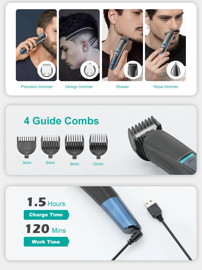 - 10 وظائف في جهاز واحد: لحلاقة وتشذيب الشعر، الذقن، الأنف، الأذن، وتشكيل اللحية بكل احترافية.